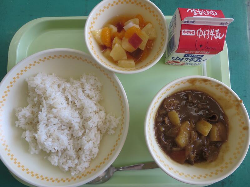 今日は地産地消給食の日です。高千穂牛を贅沢に使ったカレーライスです。牛肉には鉄分が多く含まれており、貧血を防いで集中力を高めてくれる効果があります。カレー粉に含まれるスパイスには、消化を助けたり、血行をよくして代謝を上げたりする働きがあります。また、フルーツポンチにはみかんが入っていますね。みかんにはビタミンCが含まれており、肌や喉の健康を守ってくれます。