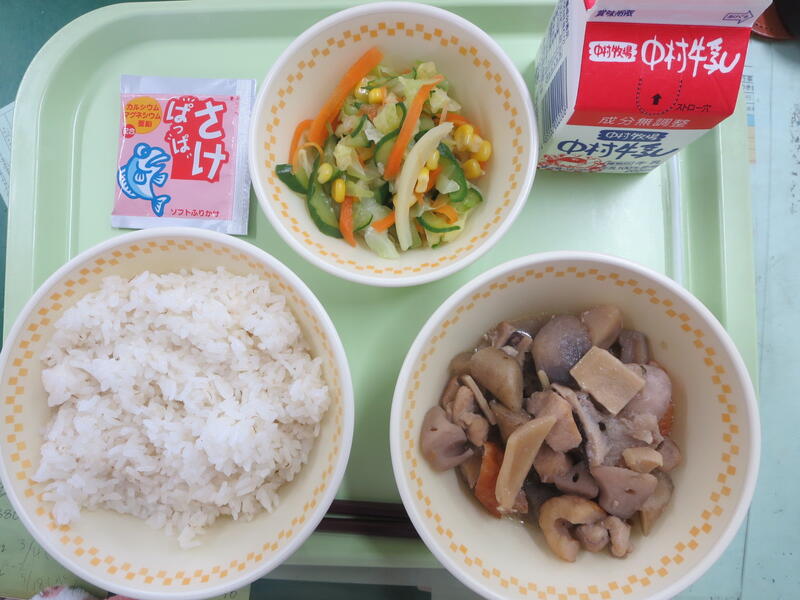 今日の「根菜のきんぴら」には、ごぼうやれんこんなど、噛み応えのある野菜が入っています。よく噛んで食べることは、あごの成長を助けるだけでなく、脳を刺激して頭をスッキリさせる効果もあります。「いなか汁」にはだいこんやねぎ、豆腐が入っており、栄養バランスも抜群です。麦ごはんを主食に、日本の伝統的なおかずに親しみ、体の芯からパワーを湧かせましょう!