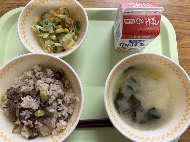 今日 はリクエスト給食 の、高千穂牛肉 のぎゅっと混 ぜご飯 を献立 に取 り入 れました!
