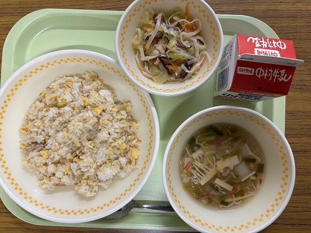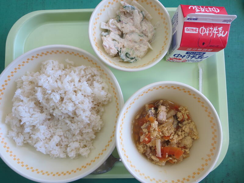 今日 の給食 は、とろりと温 かいあんかけチャーハンです。このあんのとろみをつけているのは片栗粉 です。片栗粉 は、昔 は「カタクリ」という植物 の根 っこから作 られていましたが、現在 は主 に、じゃがいものでんぷんから作 られています。とろみをつけることで、料理 が冷 めにくくなり、最後 まで温 かく食 べられるだけでなく、具材 が麺 やご飯 に絡 みやすくなって栄養 を逃 がさず摂取 することができます。ご飯 に上手 にかけて食 べてくださいね。