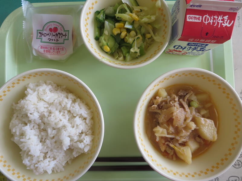 今日はリクエスト給食のキムチーズ肉じゃがを献立に取り入れました!"