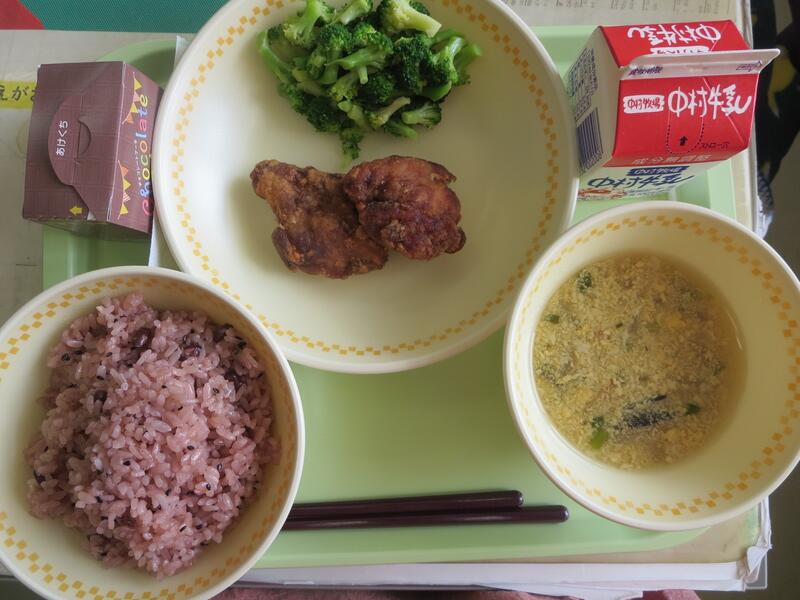 いよいよ、明日は卒業式です。6年生は、小学校で食べる最後の給食ですね。今日は、明日の卒業式をお祝いする赤飯についてお話しします。日本では昔から赤い色には、悪いものを追い払う力があると考えられており、おめでたい行事のときに赤飯を食べる習慣があります。赤飯の赤色は、一緒に炊き込む小豆の色が移ったものです。今日は、デザートの卒業お祝いケーキと一緒に、6年生の門出をみんなでお祝いしましょう。