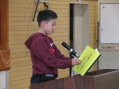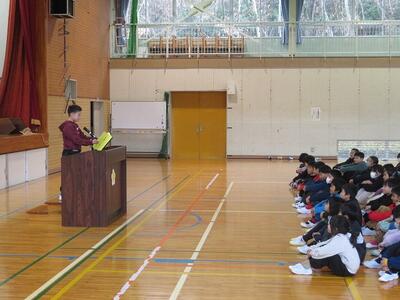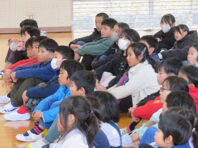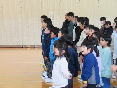 12月24日(水)に2学期の終業式を行いました。まずはじめに、児童を代表して3年生が発表を行いました。2学期の思い出の中で特に、町の音楽祭について発表しました。「初めてチャレンジしたウッドブロックに苦戦したが、練習を重ね、演奏できた。努力してできるようになることはうれしい。」という成長ぶりを発表してくれました。また、3学期や4年生に向けての決意も述べました。立派でした。校長の話では、始業式の日の話の内容であった「いのち」「あいさつ」「なかよく」「チャレンジ」について振り返りを行いました。子どもたちは挙手などしながら自分を振り返りました。最後に校歌を3番まで元気よく歌い、終業式は終了しました。