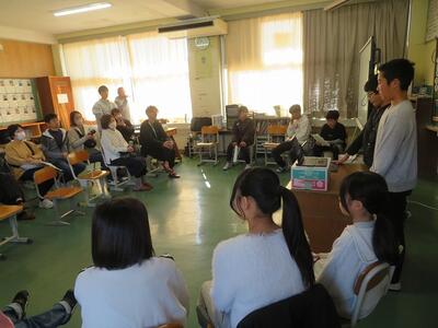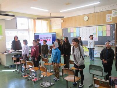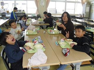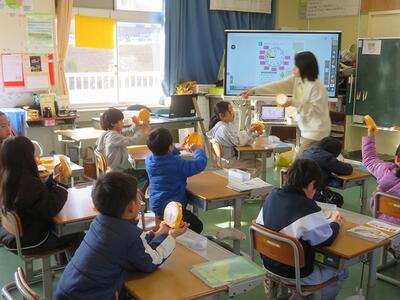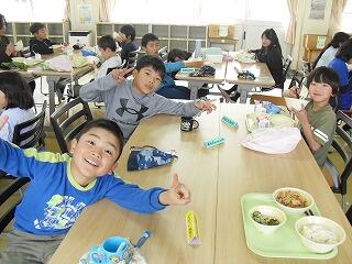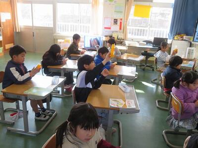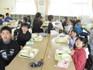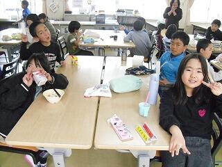 2月19日(木)に日之影町の佐藤貢町長が給食の時間に学校にお見えになりました。5・6年生と給食の会食をするためです。佐藤貢町長は、はじめに給食の受け渡しの様子をご覧になりました。その後、5・6年教室に移動し、5・6年生と一緒に会食を行いました。この日の給食のメニューに、日之影町産のゆず果汁が使用されていました。5・6年生児童は、はじめは緊張気味でしたが、佐藤町長と家族の話や習い事の話などをしました。「普段、お昼ご飯はどこで食べていますか?」等の身近な話題の話をする児童もいました。途中、佐藤町長と牛乳じゃんけんをする場面もあり、盛り上がりました。最後に、佐藤町長が日之影町という名前の由来の説明や町長直筆のメッセージをもとにしたお話をしてくださいました。児童は、佐藤町長の話を真剣に聞き、町長の思いを胸に刻みました。ご多用な中、本校の子どもたちと会食や交流をしていただきました佐藤貢町長に感謝申し上げます。ありがとうございました。
