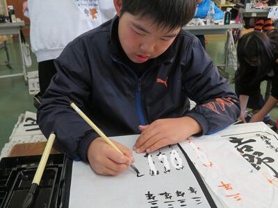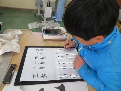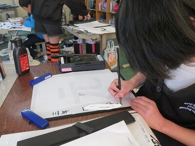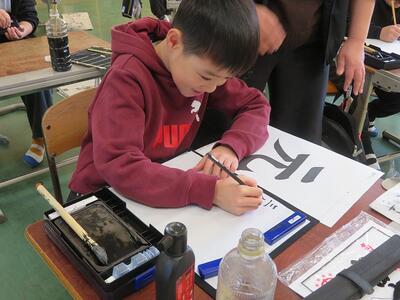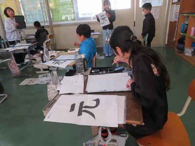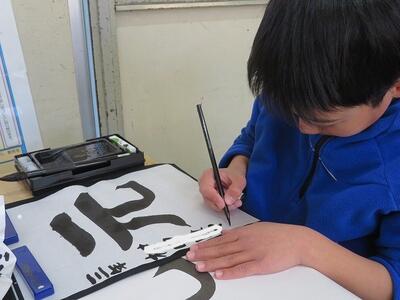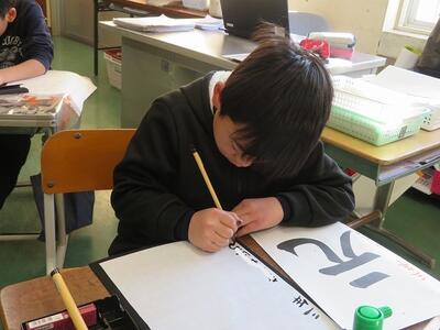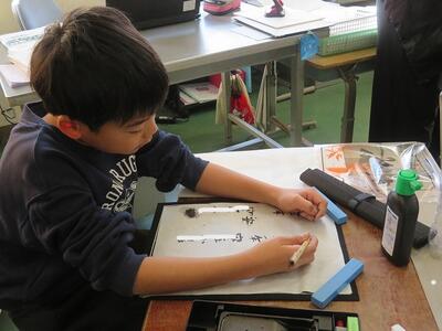 3年生が、習字に挑戦しました。今回挑戦したのは「元」という文字です。はねや払いの部分が難しいようで、何度も挑戦していました。思い通りの字が書けた後は、小筆で名前の練習を行いました。大筆の使い方とは異なるため、何度も何度も練習をしていました。自分の納得する「元」という文字の左側に、慎重に慎重に自分の名前を書き足していました。3年生から始まった習字の学習ですが、1年間で大きく成長した3年生の子どもたちです。