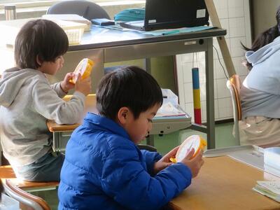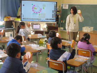 1年生が、時計をよむ学習を行っています。「短い針で何時かをよむ」「長い針で何分かをよむ」というきまりを学習して、実際に時計の模型を動かしながら学習しています。この日は、授業の始まりと終わり、給食の時間の始まりと終わりなど、実際の学校生活と結びつけてよみ方の練習を行っていました。担任から指定された時刻を時計で表すことができると「できました!」と元気な声が飛び交いました。このように実際に時計の模型を操作しながらよみ方を身に付けていきます。いずれは模型を使わずに目で見てよむことができる日が来ることでしょう。今後の成長が楽しみです。