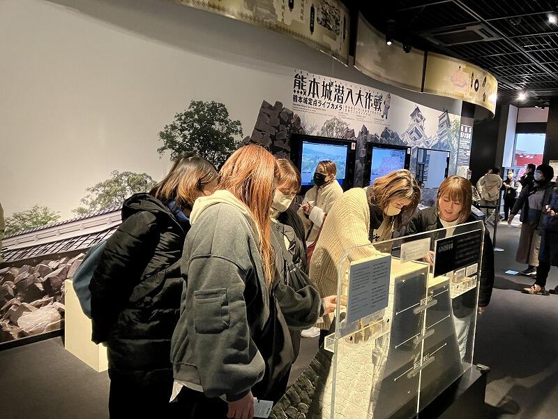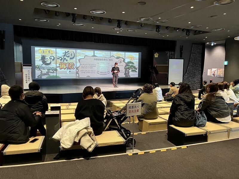 「熊本城ミュージアム わくわく座」では、江戸時代から熊本地震被災前の熊本城の姿や、西南戦争で攻められた際も耐え抜いた堅牢な守りなどの説明をVR映像と寸劇で鑑賞しました。