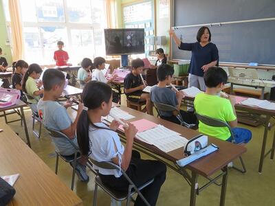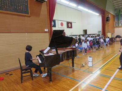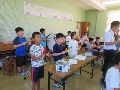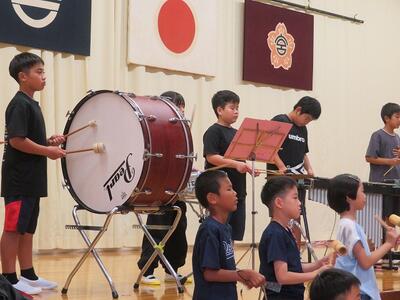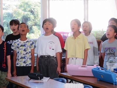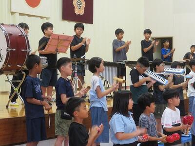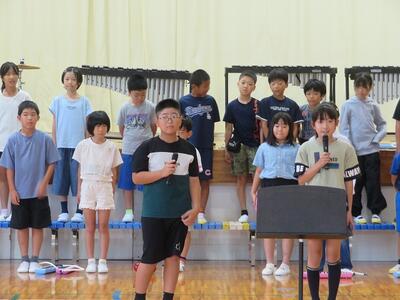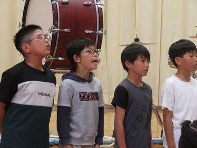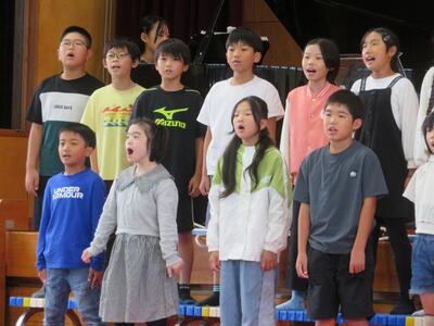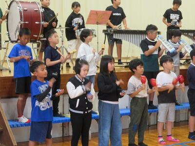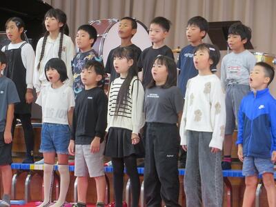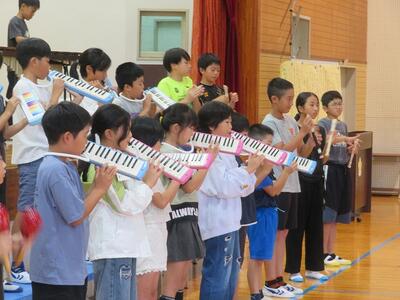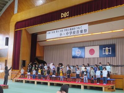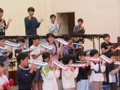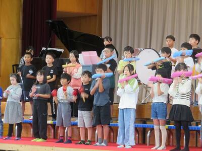 10月24日(金)に「令和7年度 学校と地域をつなぐ小・中学校音楽祭」が行われます。その日に向けて、1・2年生と3・4・5・6年生がそれぞれ合同練習を行いました。1・2年生は、歌の練習を行いました。出だしの部分の歌い方や間奏部分の振り付け等の練習を行いました。3・4・5・6年生は、合唱や合奏の練習を行いました。特に合奏では、全ての楽器の部分練習を終え、曲全体を通しての練習でした。次第に完成に近づいてきています。本番へ向けてこれからも練習が続きます。