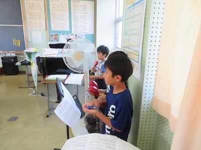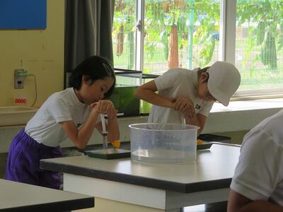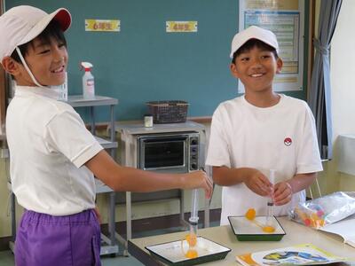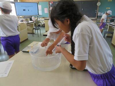 4年生では、理科で「空気と水の性質」について学習しています。これまでの学習で、空気について学んできています。空気の性質として、「空気は押し縮められる」ことを学んでいます。この時間は、「水も押し縮めることができるだろうか」というめあてのもと学習を行いました。学習のはじめに、子どもたちは、全員が「押し縮められる」と予想していました。そして、実際に実験を行うと「全然押し縮まりません。」「手応えが固い。」などの声があちこちから聞こえてきました。子どもたちは、予想と違う結果に驚くとともに実験の楽しさを味わっていました。実験の中で様々な発見ができる理科の学習は、子どもたちにとってとても楽しい学びの時間です。