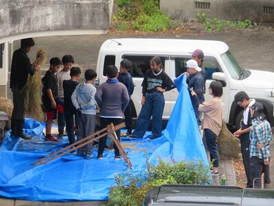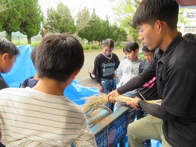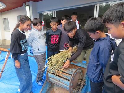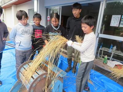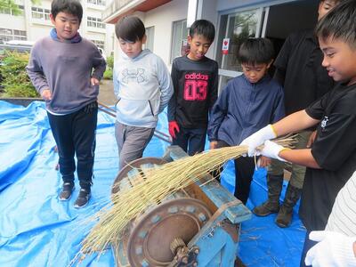 10月9日(木)に刈った稲の掛け干しによる乾燥が終わり、脱穀の時期を迎えました。そこで、5年生が稲の脱穀体験をしました。足踏み式の脱穀機を使っての脱穀です。足踏み式脱穀機は、足で踏む部分の踏み方によって、脱穀する部分が前の方に回転したり、後ろの方に回転したりしてなかなか難しく、子どもたちが苦労していました。こつをつかみ、うまく回転し出し、脱穀できるようになると、とても楽しそうでした。現在は、コンバインで稲刈りをすることも多く、今回の体験はとても貴重な時間でした。食卓でご飯を食べるまでにはたくさんの手間と苦労があることが分かり、そのありがたさを感じたことでしょう。ご協力いただきました保護者の皆様、ありがとうございました。