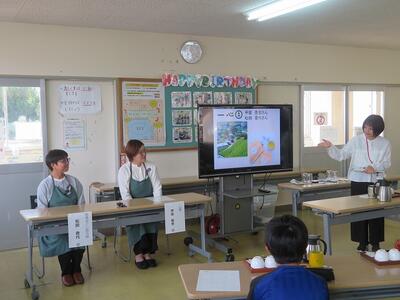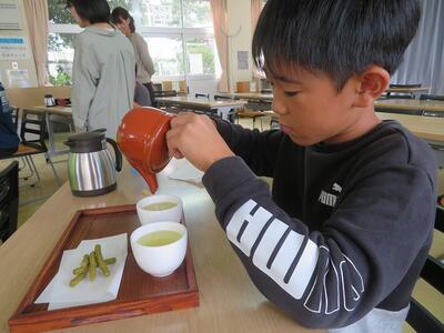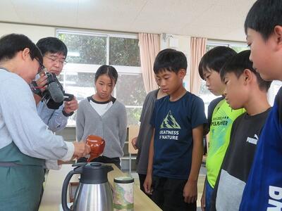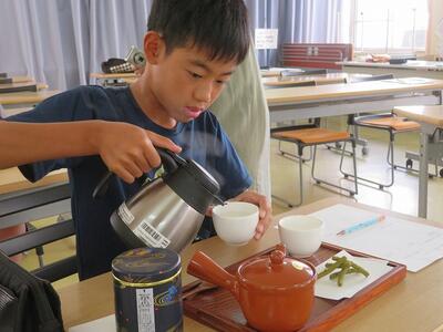 10月23日(木)に5年生が釜炒り茶について学習しました。宮水小学校区内でお茶の生産をされていらっしゃる一心園の甲斐泰世様と地域おこし協力隊の松田香代様を講師としてお迎えしての学習でした。釜炒り茶の特徴やお茶の入れ方の学習をした後、実際にお茶を入れる体験をさせていただきました。そして、自分で入れたお茶を飲んでみて「色」「香り」「味(うま味、苦み、渋み)」を確かめました。他に、ウーロン茶や紅茶の試飲も行いました。同じ茶葉からウーロン茶や紅茶ができることを知り、驚いていました。今回のお茶の学習を通して子どもたちは、全国で生産されている釜炒り茶がとても少なく(全国で0.03%の生産量)、西臼杵郡が全国1位の釜炒り茶の生産量であること等を知り、改めて自分の住んでいる日之影町の素晴らしさを実感していました。ご協力いただきました一心園の甲斐泰世様と地域おこし協力隊の松田香代様に感謝いたします。ありがとうございました。