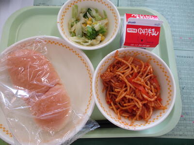今日は、1~5年生が遠足だったので、6年生は、ランチルームで給食を食べました。