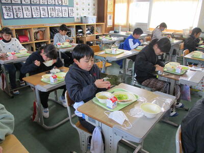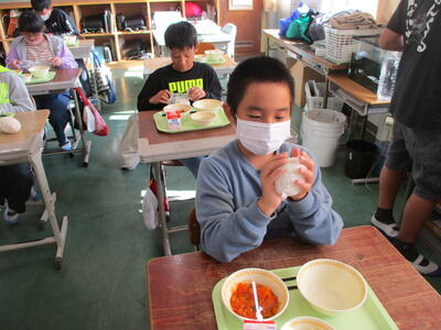 今日から、1年生の給食が始まります。1年生のみなさん、入学、おめでとうございます。小学校の給食は、クラスのみんなで協力して、給食の準備をします。たとえば、机をふいたり、おぼんを配ったり、ランチルームへ行って給食を取りに行ったりして、給食を食べる準備をします。他にも、いろいろな給食の準備があるので、どんな準備があるのか、給食の時間に、よく見ていてくださいね。そして、小学校の給食では、日之影町で育てられた食べ物をつかったものも多いので、楽しみにしていてくださいね。