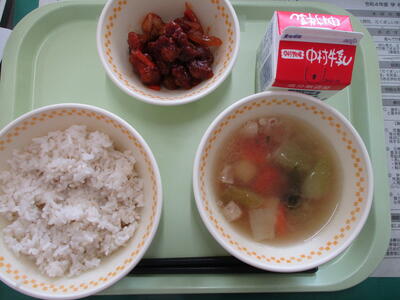 明日の木曜日は、6年生が卒業の日をむかえます。春は、卒業や入学、進級など、多くの人が節目を迎える季節です。そのようなお祝いのときに欠かせない食べ物は、赤飯です。赤飯は、もち米にあずきの煮汁で赤い色をつけて蒸して作ります。昔から、赤い色には邪気を取りのぞく力があるとされていて、お米が赤い「赤米」を神様にお供えする習慣があったことから、赤飯が作られるようになったといわれています。今日は明日、卒業を迎える6年生と、もうすぐ進級を迎える1・2・3・4・5年生をお祝いする献立です。