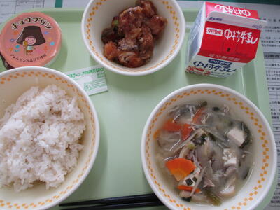 今日の給食は、1年生の入学と2年生から6年生の進級をお祝いする給食です。そこで、今日はみなさんも大好きな、チキンライスにしました。そして、お祝いのデザートもつけました。今日の給食も、しっかり食べて、午後からの授業も、がんばってくださいね!おいしく食べてもらえたら、うれしいです。