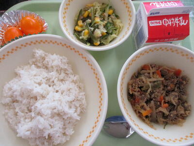 今日は給食では、おなじみの「ポークビーンズ」です。大豆と豚肉をたっぷりと使って作りました。