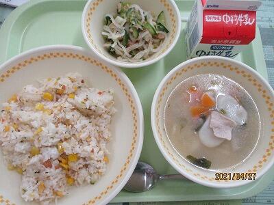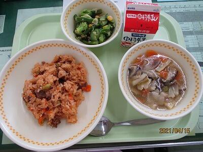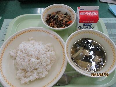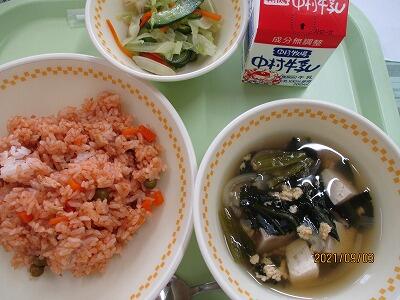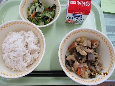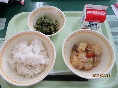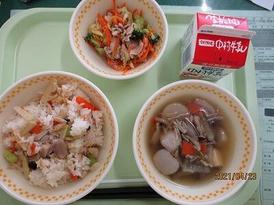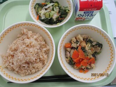 今日は1年生の入学お祝いと、2、3、4、5、6年生の進級お祝いの献立です。昔から、お祝いの時には赤飯が食べられてきました。今日の給食もおいしく食べてもらえたら嬉しいです。