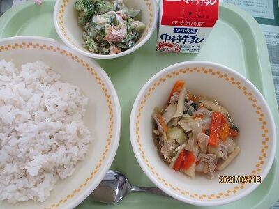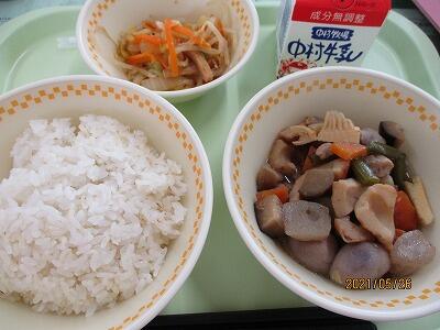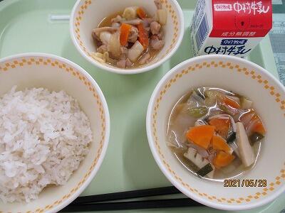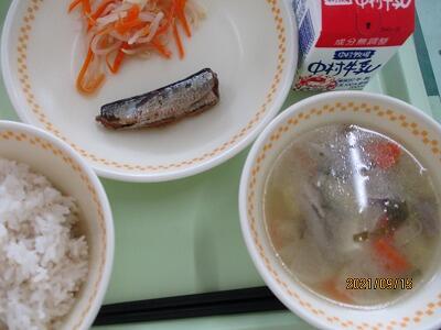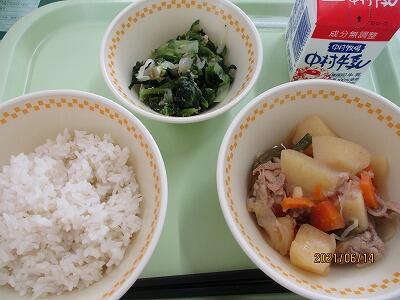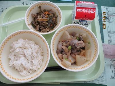 里いものとろろ汁 給食は、みなさんが1日に必要な栄養量の3分の1をとるようになっています。お家でとりにくいカルシウムやビタミン類は1日に必要な約2分の1がとれるようになっています。苦手な食べ物が出ることがあるかもしれませんが、健康な体を作るために、様々な食べ物に挑戦しましょう。