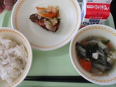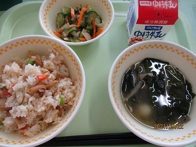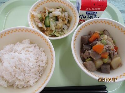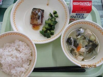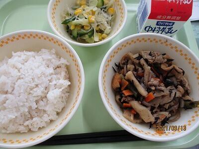 今日はカミカミデーです。れんこんやくきわかめなど、かむ回数の多い食材を多く使っています。よくかんで食べることは、健康な体を保つことにつながります。