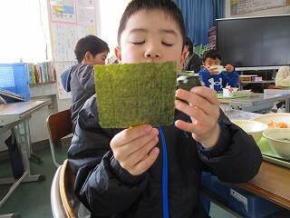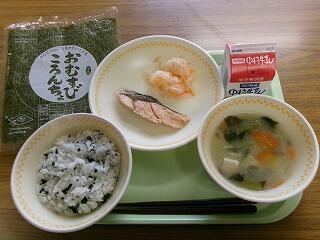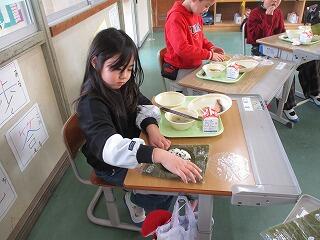 今日は、給食記念日に合わせた献立です。学校給食は、山形県鶴岡市でお弁当を持ってこられない子ども達のために、お坊さんが12月24日に「おにぎり、焼き魚、つけもの」という食事を提供したことが始まりだと言われています。12月24日は終業式の時期であるため、1か月後の1月24日を記念日としています。今日は、大きなのりにごはんをのせて、おにぎり作りに挑戦しました。!