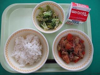 油淋鶏は、中国料理のひとつです。揚げた鶏肉に、ねぎ、しょうが、ごま油、酢などで作ったソースをかけて食べます。油淋鶏のユーリンとは調理法のことで、チーは鶏肉のことです。今日の給食では、たまねぎやにんじんを加えて彩りよくなるように仕上げました。