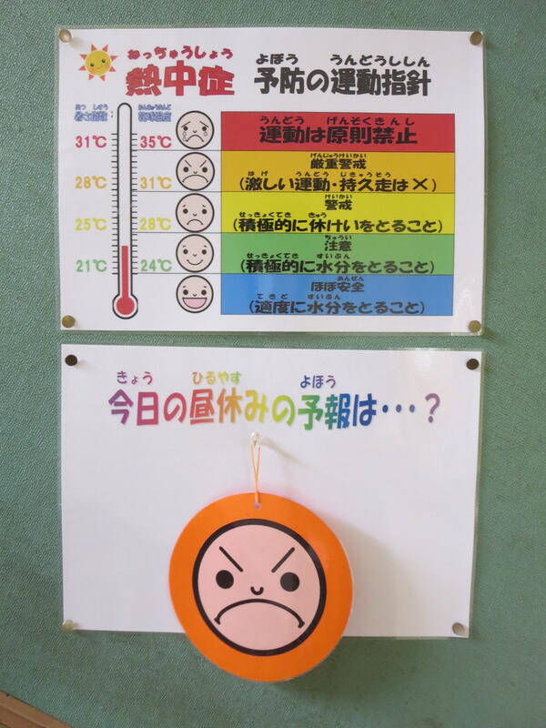 6月も終わりに近づき、だんだんと暑さが本格的になってきました。今日は、朝から蒸し暑かったですね。お隣延岡市では、今年全国で初の36℃を記録したそうです。まだ体が暑さに慣れていないこの時期は特に熱中症が心配です。そこで、宮水小では階段のところに昼休みの暑さ指数予想を掲示したり、健康委員会の児童が水分補給や昼休みの過ごし方の放送をしたりしています。