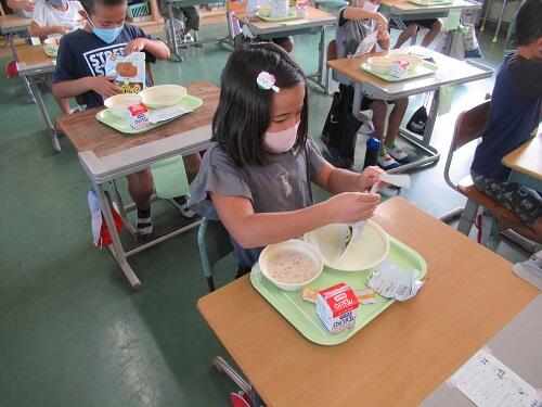 9月21日(水)の給食は、台風14号の影響のため非常食による給食となりました。メニューは、スープとパンと牛乳です。