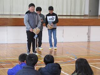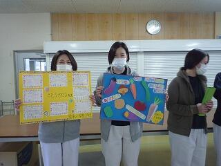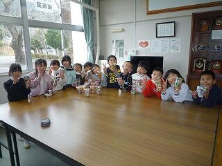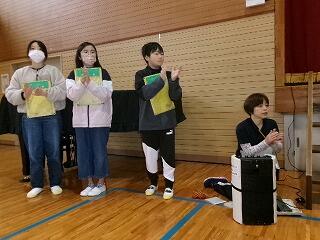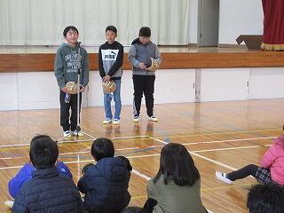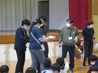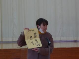 全校児童で給食感謝集会を開きました。調理員、町農林振興課、業者の方々へプレゼントを渡したり、保健給食委員会が発表したりして、給食について学びました。保健室、給食室それぞれの先生からも話がありました。