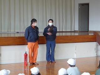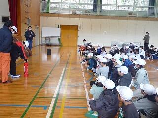 消防署の方々を講師にお迎えして火災を想定した避難訓練を行いました。避難するときは全員無言で真剣に取り組みました。天候が悪く室内で行いました。火事を起こさないために、火事のときに気を付けることなどたくさんのことを教えていただきました。消火器の使い方も習いました。代表の人が体験しました。室内なので実際に噴射はできませんでしたが貴重な勉強になりました。消防署の方々、ありがとうございました。