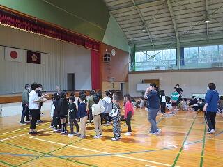 放課後子ども教室で地震の避難訓練を行っていただきました。子ども教室の先生方の御指導で避難する練習をしました。天候が悪く体育館へ避難しました。本校職員も連携して子どもたちの人数確認を行いました。下校後であっても学校にいる間は協力して児童の安全確保に努めていきます。子ども教室の先生方、御指導いただきありがとうございました。