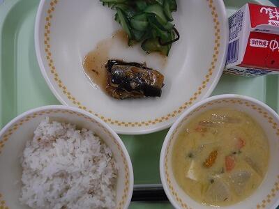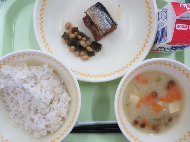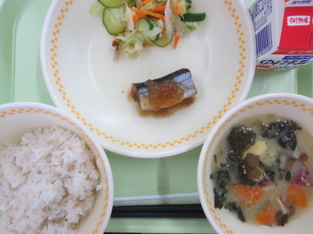 【麦ご飯 いわしの梅煮 塩こんぶあえ 豆乳みそ汁 牛乳】