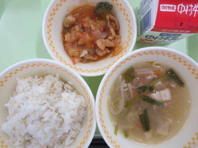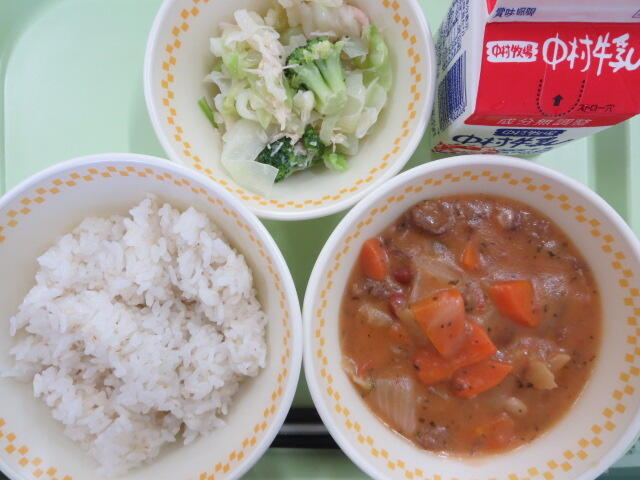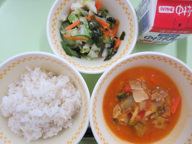 給食のトマト煮はいつもダイストマト缶を使うのですが、今日は生のトマトを使いました。いつもよりトマトの存在感を感じることができ、おいしくいただきました