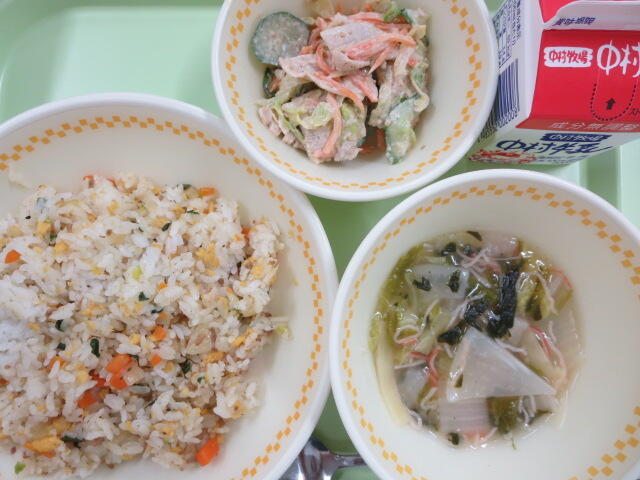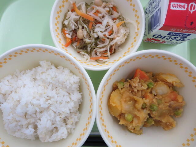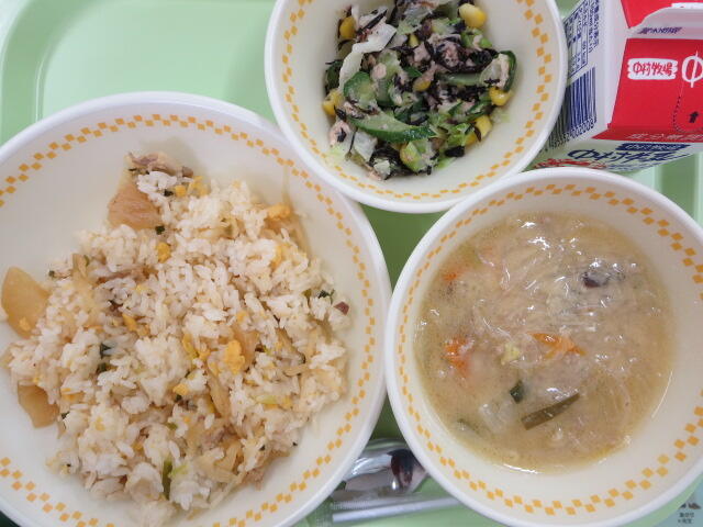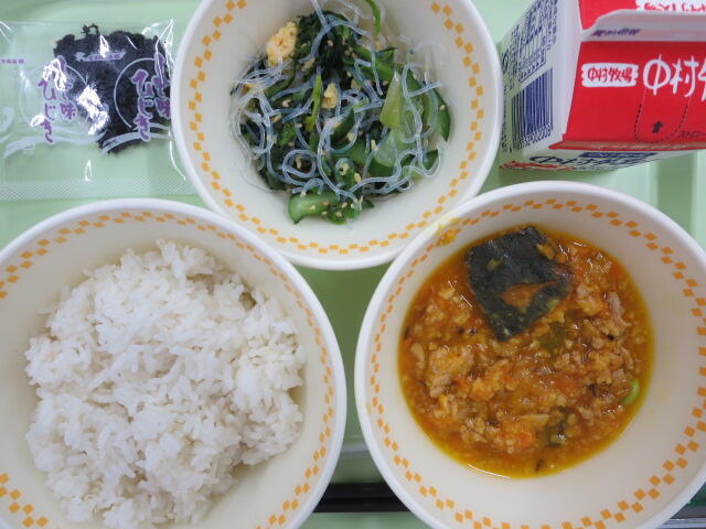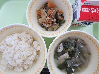【わかめごはん 五目豆 切りぼし大根サラダ 牛乳】