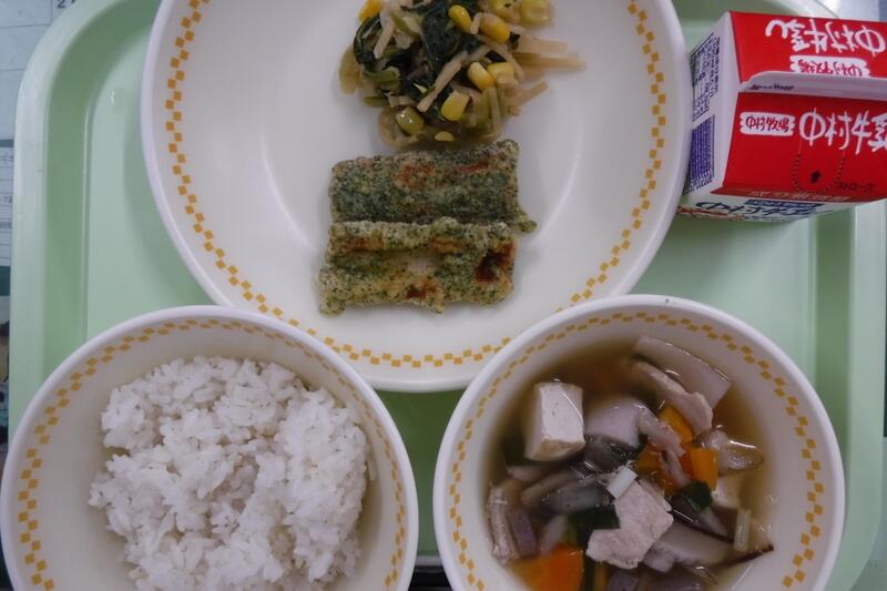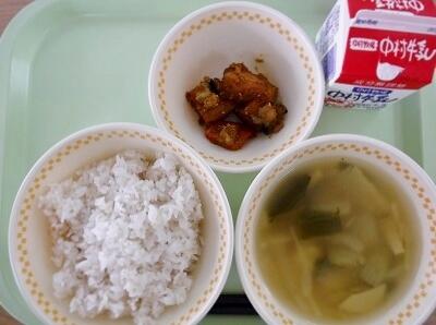 【麦ご飯 ちくわの磯辺揚げ チンゲンサイの中華いため つぼん汁 牛乳】