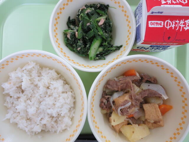 【麦ご飯 肉じゃが ほうれん草サラダ 牛乳】