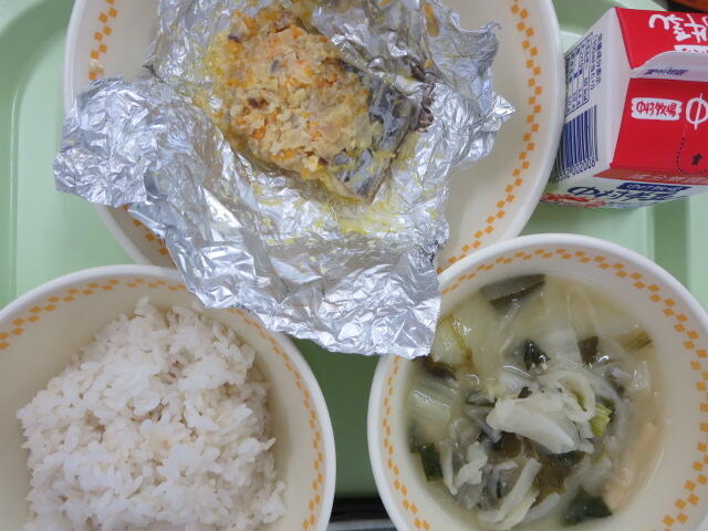 【麦ご飯 魚のホイル蒸し 切りぼし大根のみそ汁 牛乳】