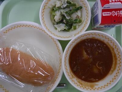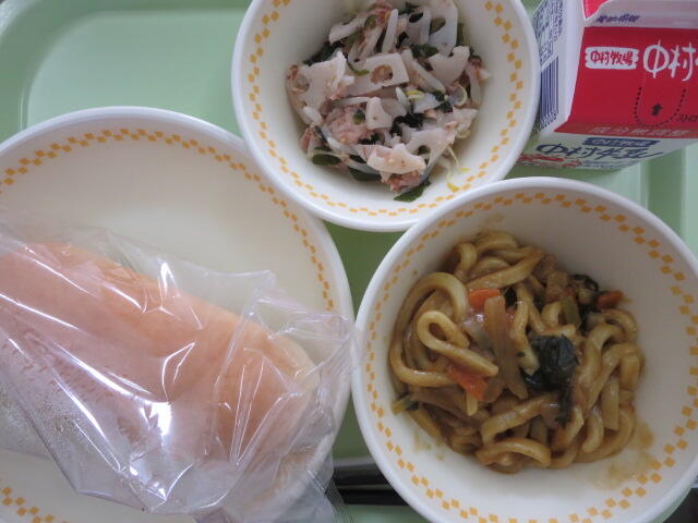 【コッペパン カレーうどん れんこんともやしの梅あえ 牛乳】