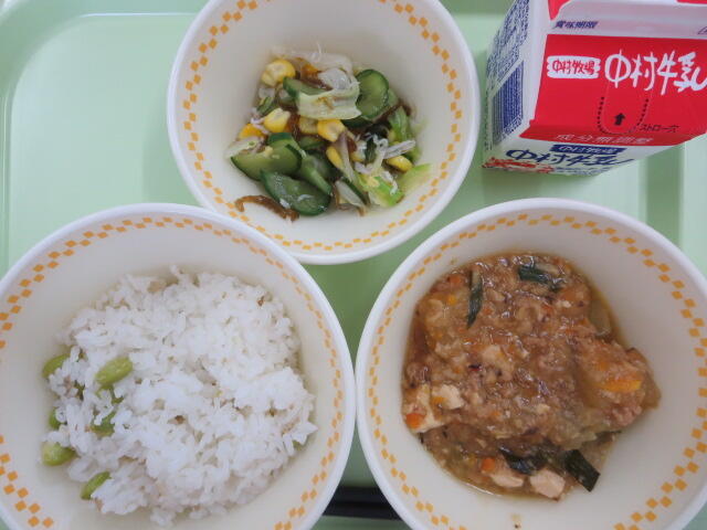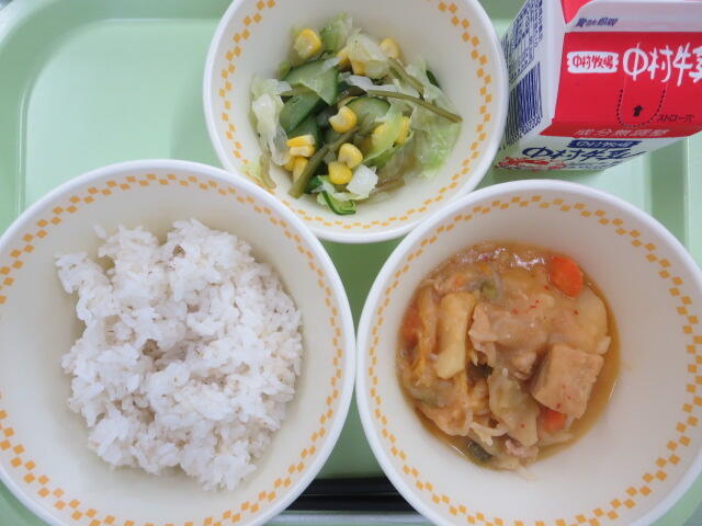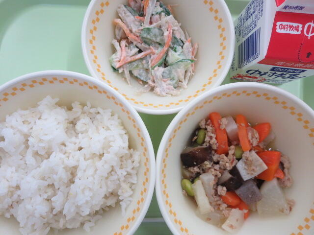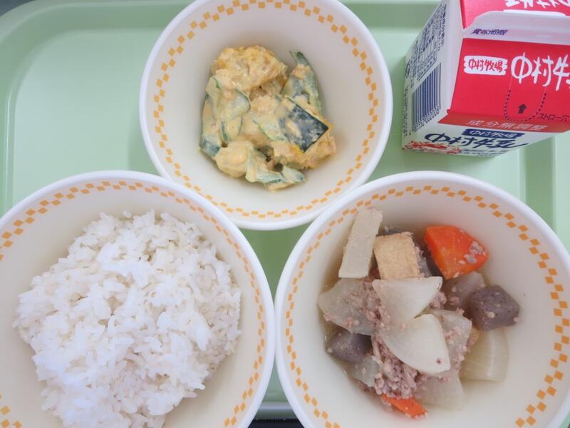 今日は小さいおかずのサラダにゆでた豚肉が入っていました。お肉が入っていると食べやすいようで、きゅうりが嫌いな子も「意外とおいしい」とパクパク食べていたそうです