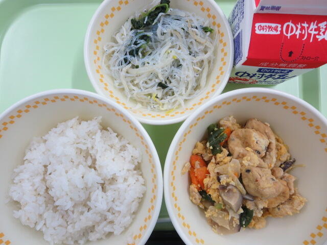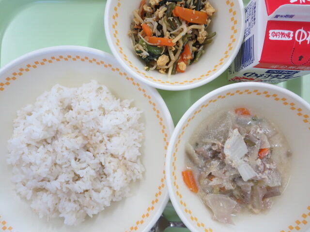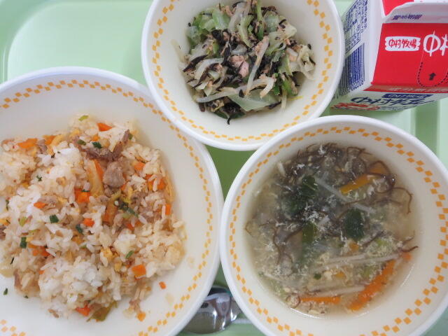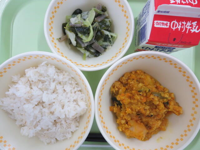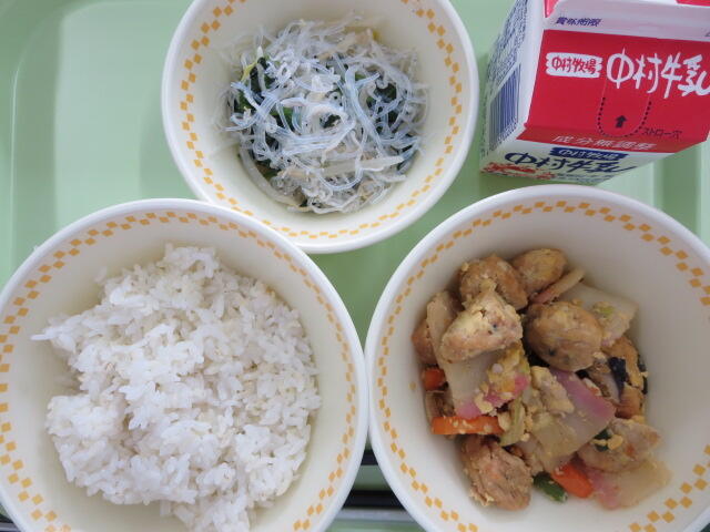 今日は学校給食記念日です。今日は当時の給食に近い献立にしてみました。食べ慣れないものだったのか噛みごたえのあるメニューだったからか、少し時間がかかっていましたが、全員完食してくれました