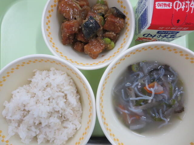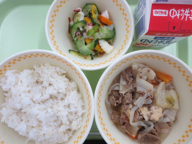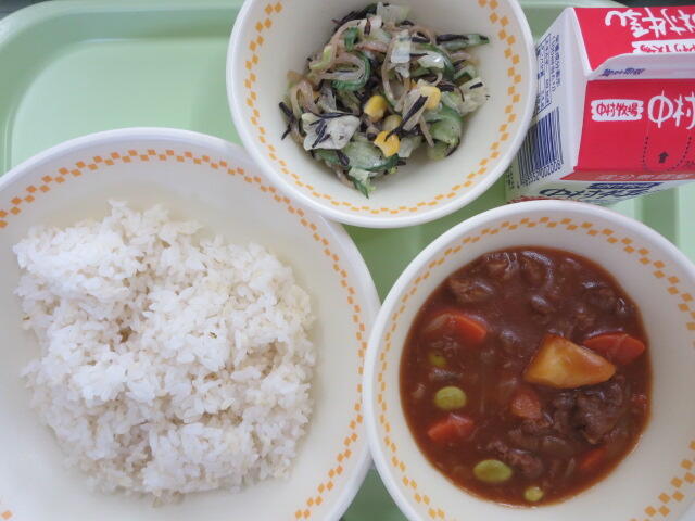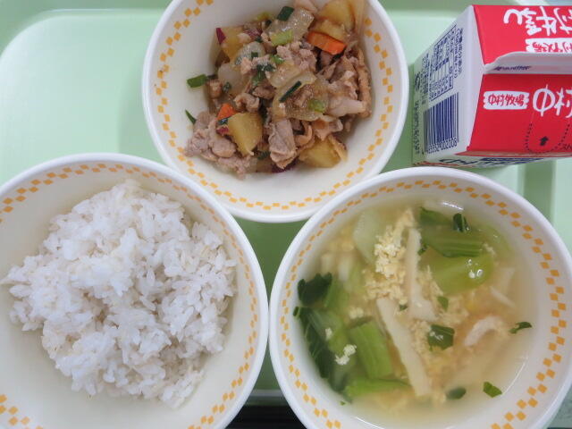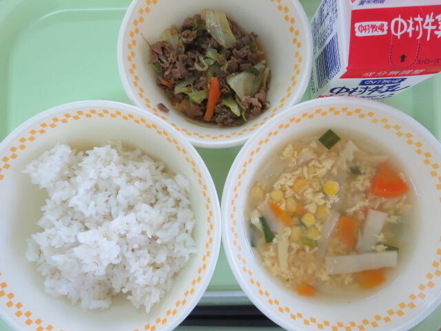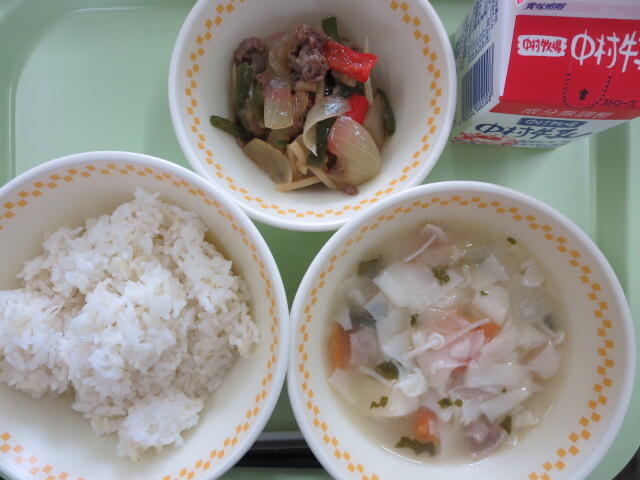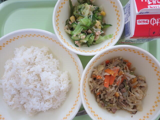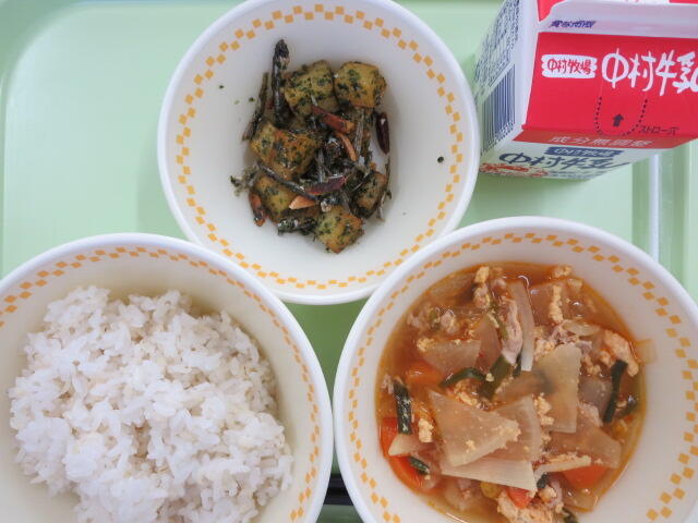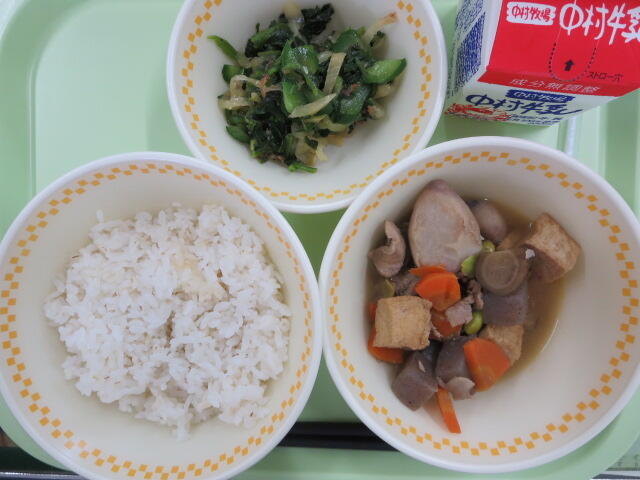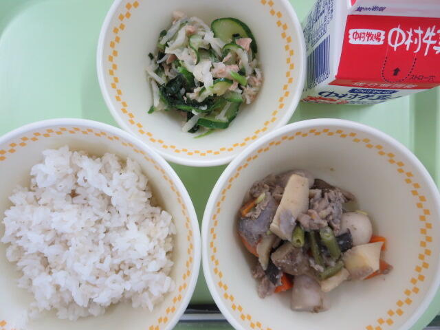 今日は地産地消給食の日です。今日のおいしさ牛っと丼に使われている牛肉、ピーマン、ごぼう、しいたけは、地産地消で地元でとれたものです。地元で作られた食べものを食べることは、新鮮でおいしいことはもちろん、食材を運ぶ距離が短いので環境に優しいというよさがあります。また、給食は食材を作る人、その食材を運ぶ人、給食を作る調理員さんなど、たくさんの人たちのおかげで食べることができます。感謝の気持ちを忘れずに、残さないようしっかり食べましょう。