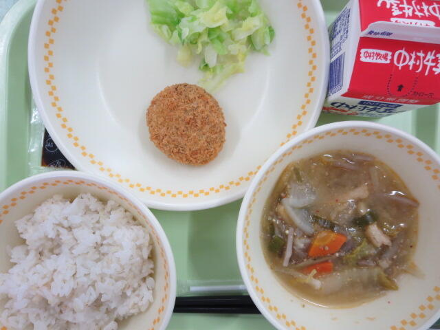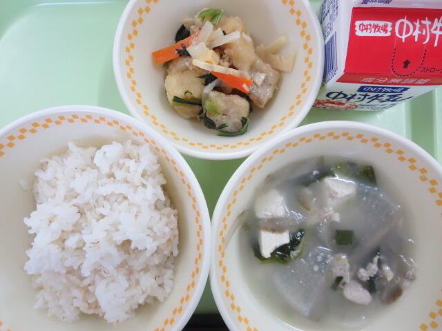 【麦ご飯 いかのさらさ揚げ ごぼうだんごスープ 牛乳】