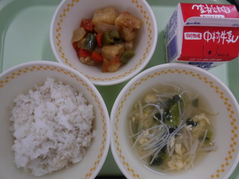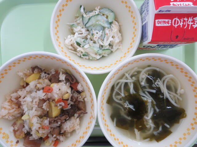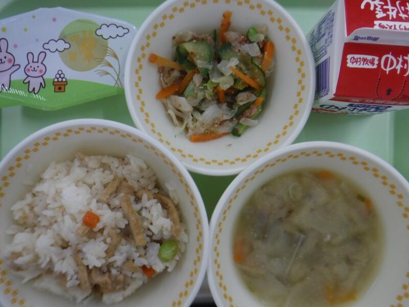 今日は干ししいたけとコーンを使った炊きこみご飯でした。バターが少し入っていて、香りが良くおいしかったですね