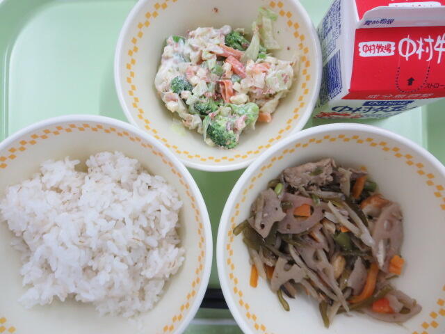 【十二穀米 根菜のきんぴら ポテトサラダ 牛乳】