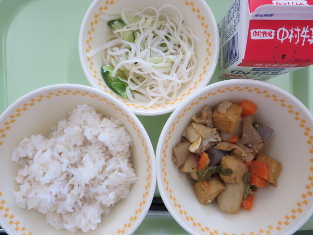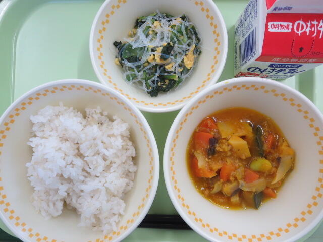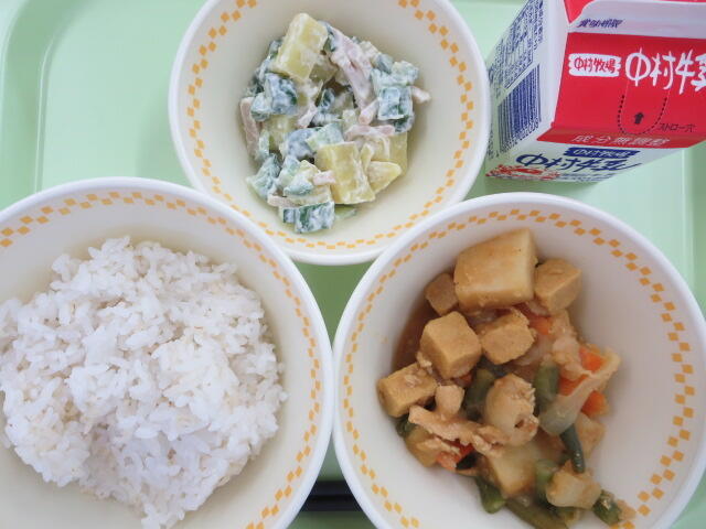 【麦ごはん 厚揚げのカレー煮 米粉めんサラダ 牛乳】