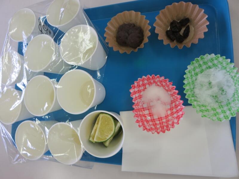 今日は自分でパンにウインナーときゃべつをはさんでケチャップをかけるウインナードッグでした。初めてあじさいゼリーを出してみたのですが、ちょうど雨になって、梅雨らしいデザートでしたね。