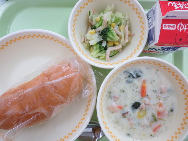【マヨネーズパン グリーンシチュー ドレッシングサラダ 牛乳】