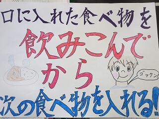 今日は、クイズを出します。食べものを食べるとき、ひとくち何回ぐらいかむといいでしょうか。①5回ぐらい ②10回ぐらい ③20回以上答えは、③20回以上です。みなさん、20回以上かんでいますか。給食の時間は、食べる時間が決まっているのであまりゆっくり食べることはできませんが、よくかんで食べることを意識しながら食べましょう。よくかむことは、胃や腸など体にもいいし、食べものの味がよくわかるようにもなります。家での食事でも意識してくださいね。