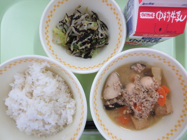 3学期が始まり、なかなか起きられないで朝ごはんを食べてこなかったり、飲みものだけしか飲んでこなかったというような人はいませんか。まだまだ寒い日が続きますが、寒さに負けず、勉強や運動をがんばりましょう。今日の給食は、少し遅いですが「雑煮」です。お雑煮は、その年に幸せをもたらしてくれる神様を迎えるため、地域の産物と餅を一緒に煮て、神様といっしょに食べる料理とされています。今日の雑煮にはかわいいハッピーにんじんが入っています。見つけた人はいいことがあるかもしれませんね。味わって食べましょう。