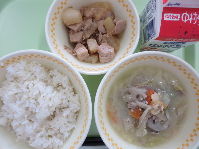 【麦ご飯 まぐろ大根 豆豚汁 牛乳】
