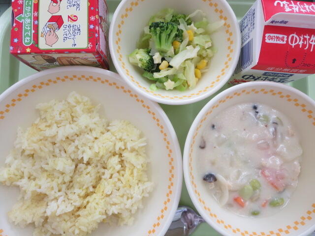 パンとシチュー、比較的食べやすい野菜のサラダという組み合わせだったので、どの学年も時間内に食べ終わっていました。1年生は、達成感のある表情で「歯みがきに間に合った!」という報告をしてくれました。毎日パンがいいという人もいましたが、残念ながらそういうわけにはいきませんね
